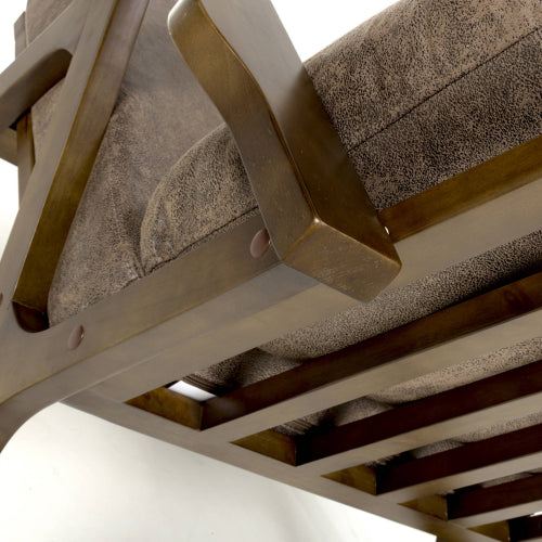This rustic style armchair effortlessly pairs a vintage feel with a distinctive modern angled frame. The soft, removable brown suede effect cushions provide excellent comfort, supported by a signature diagonal braced walnut rubberwood frame. A matching wooden angled slatted back completes the ultra stylish look. Assembly required. Sold individually.