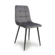 A gently sloped contemporary dining chair, upholstered in sleek blue brushed velvet fabric. The comfortably contoured seat and back feature stylish square panelled stitching. Fitted with cross frame tapered black metal legs. Assembly required. Sold in boxes of 4.