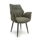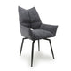 An ultra modern swivel dining chair in a striking angular design. Its pointed corners and feature triangular cutout exude contemporary style. The invitingly pleated plush charcoal upholstery comes in a subtle textured weave pattern. The seat smoothly swivels 180 degrees before gently returning to a central position. The black metal cross frame base drops down into sleek, pointed legs with adjustable feet. Assembly required. Sold in boxes of 2.